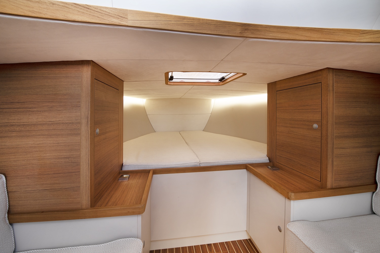The pristine deck boasts flush hatches and is adorned with Permateek decking, a sustainable material crafted from renewable, solvent-free resins.