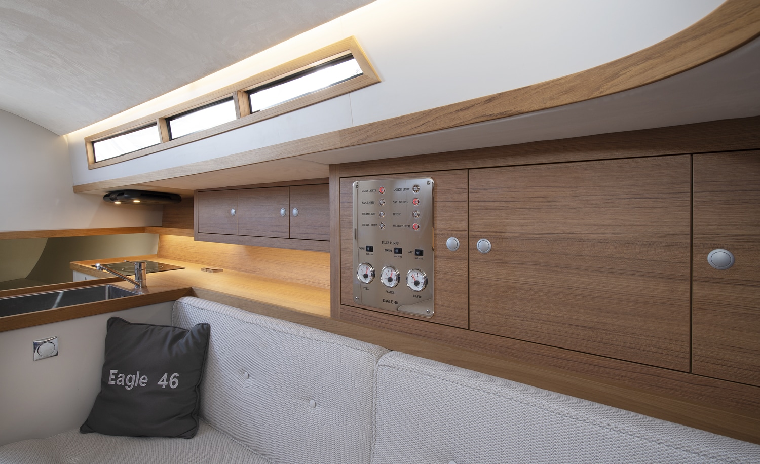 A modern white interior with mahogany trims, a full mahogany interior matt or high gloss varnished or even a light oak wood interior. All options are possible. Combine this with a wide choice of fabrics for upholstery both in the cockpit and interior to match with your preferred styling for exterior and interior woodwork and your Eagle 46 will be custom build for you. We would be pleased to assist you in styling your Eagle 46.