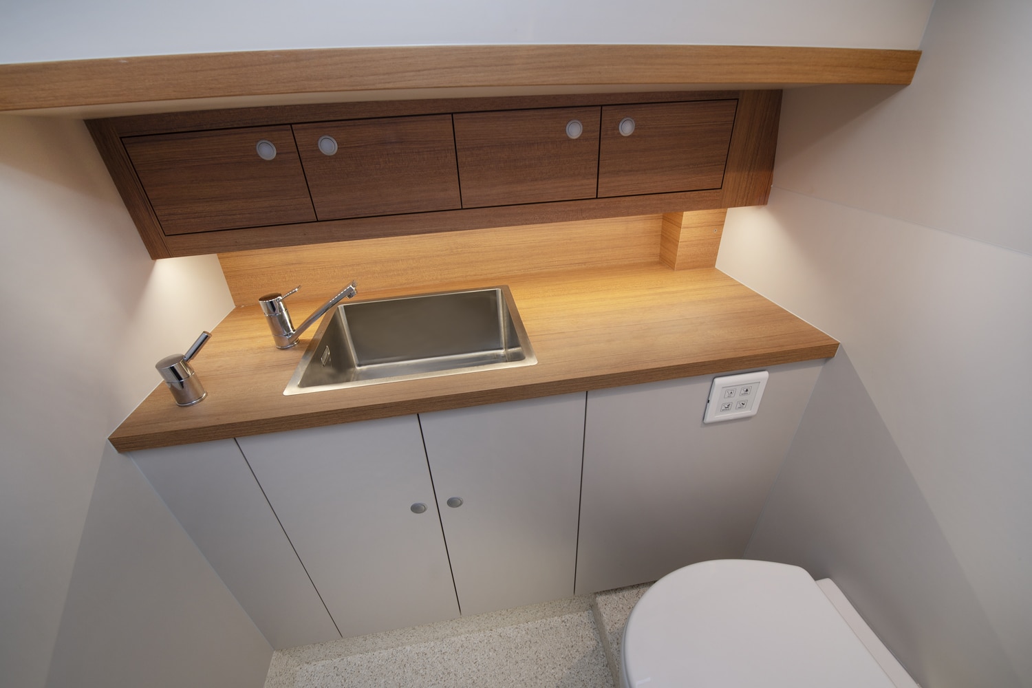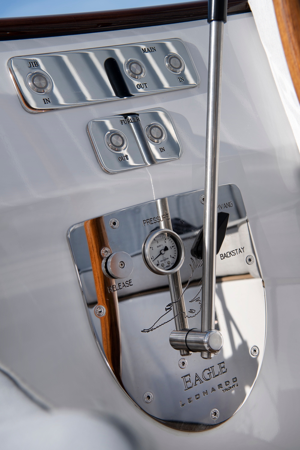 Um ein aufgeräumtes Deck zu erhalten, ist der motorisierte Vorstagroller diskret unter Deck platziert, während der Baumniederholer und das Achterstag bequem vom Steuerstand aus über das maßgefertigte Leonardo Yachts Hydraulikpaneel gesteuert werden.