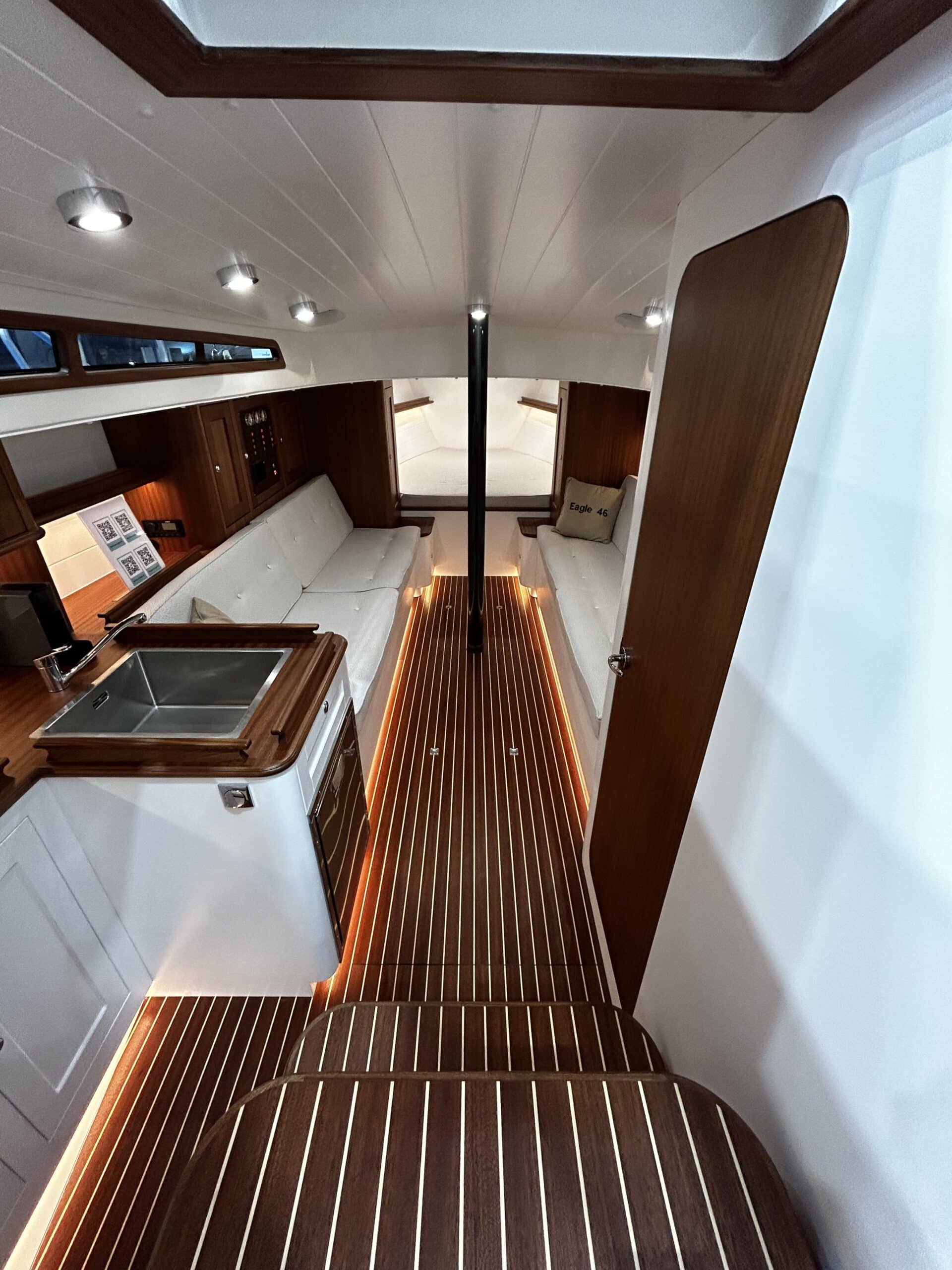 The large and deep cockpit stands out from comparable yacht in this size. The flush decks and easy accessible deck gear will make sail handling quick and simple from the cockpit. The long overhangs and low freeboard will give the stunningly beautiful look and under sail she will perform well balanced and fast. Down below the Eagle 46 allows for ample interior space with enclosed bathroom and a small galley station with a spacious salon and sleeping accommodation to allow for longer periods on board.