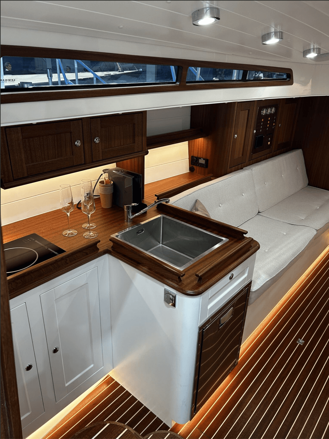 Im Interesse einer benutzerfreundlichen Handhabung und des Einhandsegelns sind die Fockwinden strategisch in leichter Reichweite des Steuermanns positioniert. Zur Vereinfachung der Großsegelsteuerung ermöglicht eine elektrische Gefangenwinde, diskret unter dem Deck installiert, das mühelose Trimmen des Großsegels auf Knopfdruck.