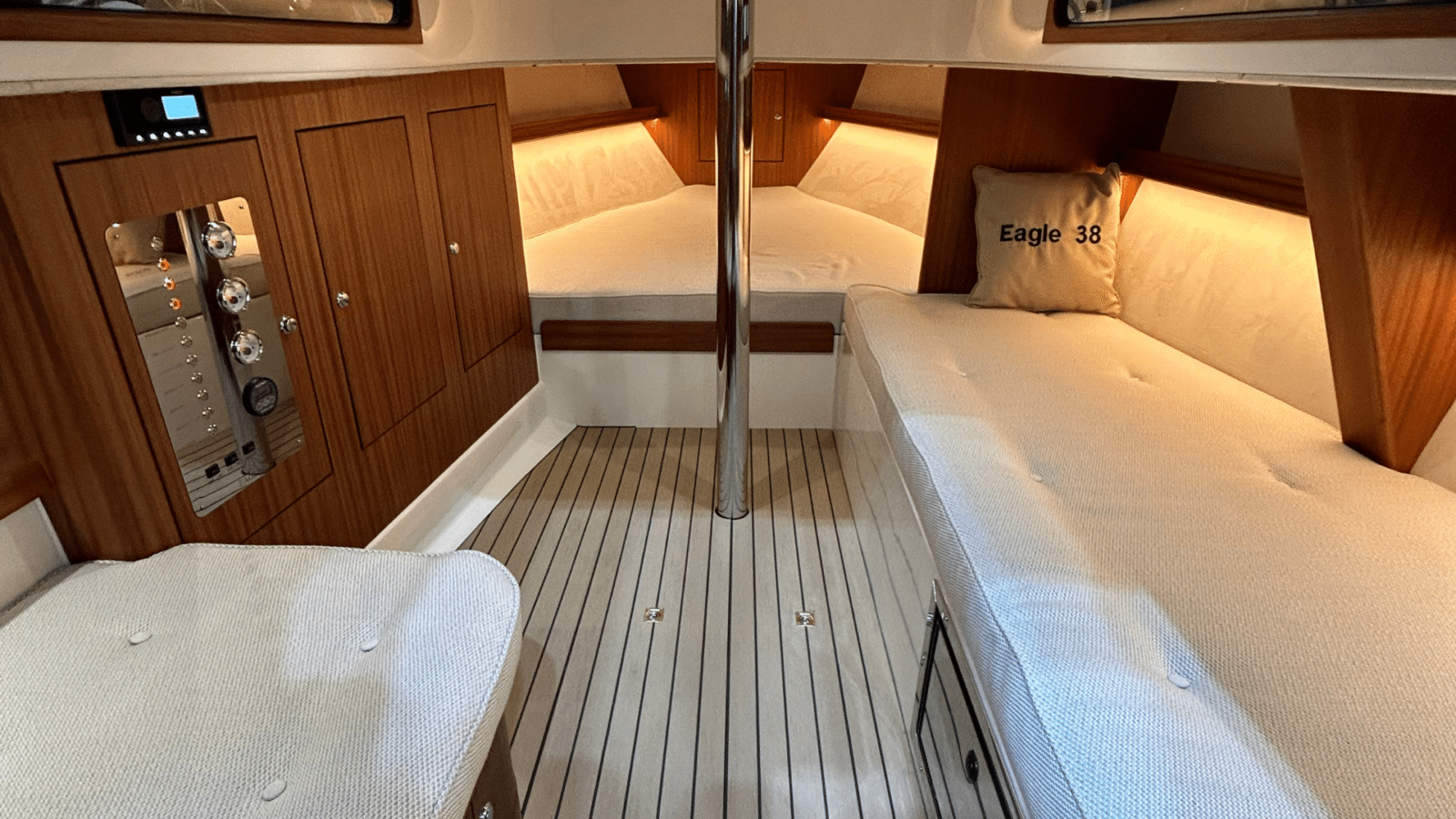 The interior of the Eagle 38 is light and airy with plenty of daylight and warm LED lights. The varnished mahogany furniture and ceiling in alcantara give this 38 foot sail yacht an elegant and luxurious feel. The interior offers sleeping space for three people. To complete the comfort of a daysailer, a toilet is convenient and neatly built in out of sight in the cabin.
