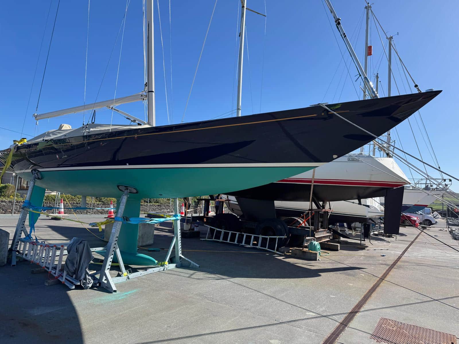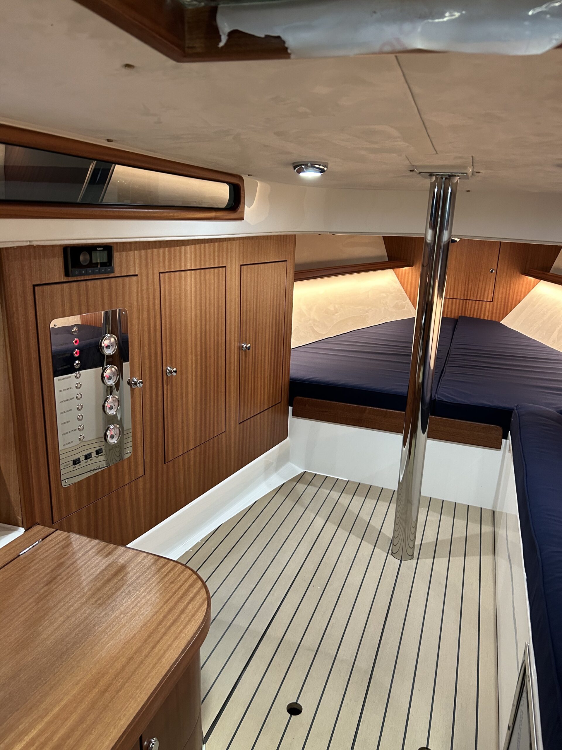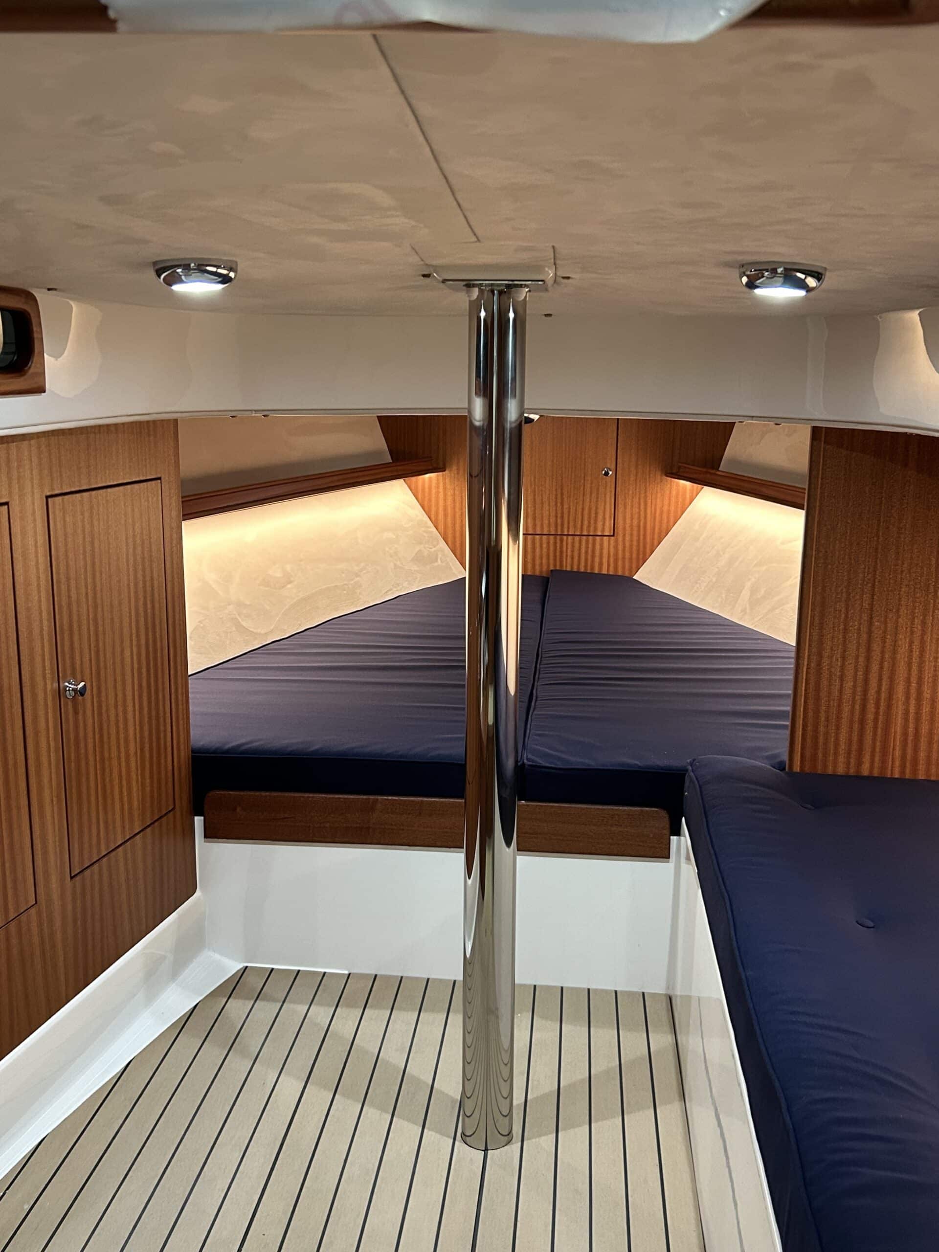 This Eagle 38-024 is available for sale. She is a luxury daysailer and comes highly equipped, featuring electric winches, electric mainsheet winches, a cockpit shower, a stainless steel swimming ladder, an electric toilet, an Axiom 7'' display, and a Bluetooth radio with two outdoor speakers.